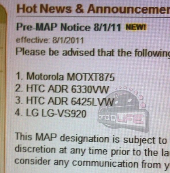 Just when we thought August was going to be a slow month around these Verizon parts, we get slapped with their latest MAP (minimum advertised price) list that includes some pretty major players. The first one we’ll talk briefly about is in position 1 as the Motorola MOTXT875, which many of you may know as the brand new DROID Bionic. But since we’ve been told that it won’t be out until September, let us quickly move on to devices that could be out before it ever sees a store shelf that are also on the list.