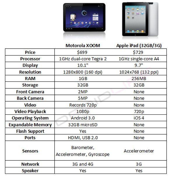 The price of the Motorola XOOM has been quite the topic of discussion over the last couple of days. Here is a comparison chart of the XOOM ($699) to the 32GB 3G iPad ($729). Yes, we actually compared it to the version of the iPad that matches up closest rather than to the $499 Wi-Fi-only model that so many keep referring to. This battle isn’t even close. Chart after the break.