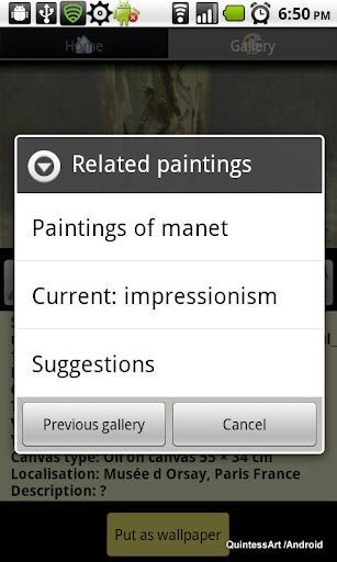 painters,currents,museum,musée,galerie,gallery,dia porama,slideshow,quiz,masterpieces,oeuvres,arts,ar tists,paintings,tableaux,search,android,orsay,louv re,hermitage,pinacotheque,Claude Monet,Edouard Manet,Gustave Courbet,Gustav Klimt,Boticelli,Rubens,Paul Gauguin,Vincent Vangogh,Henri matisse,Caravage,Johannes Vermeer,Paul Cezanne,Tintoret,Eugene Boudin,Francisco de Goya,Diego Velasquez,Arcimboldo,Jean-Baptiste Camille Corot,Camille Pissarro,Arcimboldo,Bruegel,Gustave Caillebotte,Leonard de Vinci,Auguste Renoir,Impressionnism,Realism,Symbolism,Renaissanc e,Fauvism,Mannerism,Romanticism,joconde,dejeuner,c anotier,ombrelle,nature morte,dessins,huile sur toile,oil on canvas