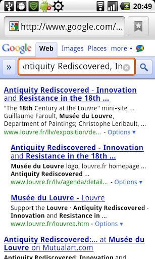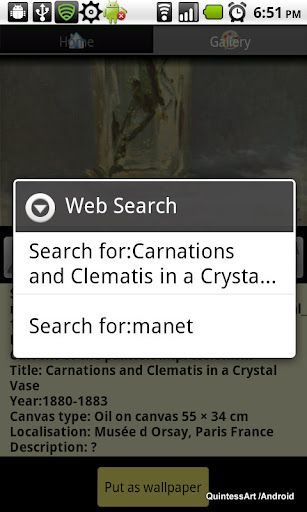 QuintessArt proposes nice user experience when searching for paintings. The application provides cool search interface, making you discover new paintings via suggestions, bookmarks, notes, slideshow,sharing paintings, notes and bookmarks by email and a quiz. It enables in a cool manner to learn more about currents and great painters. For the moment more than 20 painters, 8 currents and more than 1600 paintings...more coming soon.